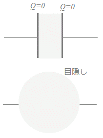 右図の[Next→]ボタンを繰り返し押して,電荷が出入りする様子を見てください.そのとき,コンデンサに目隠しをした下の図では「左から電荷が流れ込んで右に出て行く」「右から電荷が流れ込んで左に出て行く」ように見えることを確かめてください.