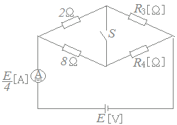 図のような直流回路において,スイッチSを閉じても,開いて も電流計の指示値は,[A]一定である。このとき,抵抗R3 [Ω],R4[Ω]のうち小さい方の抵抗[Ω]の値として,正しいのは次のうちどれか. ただし,直流電圧源はE[V]とし,電流計の内部抵抗は無視できるものとする。